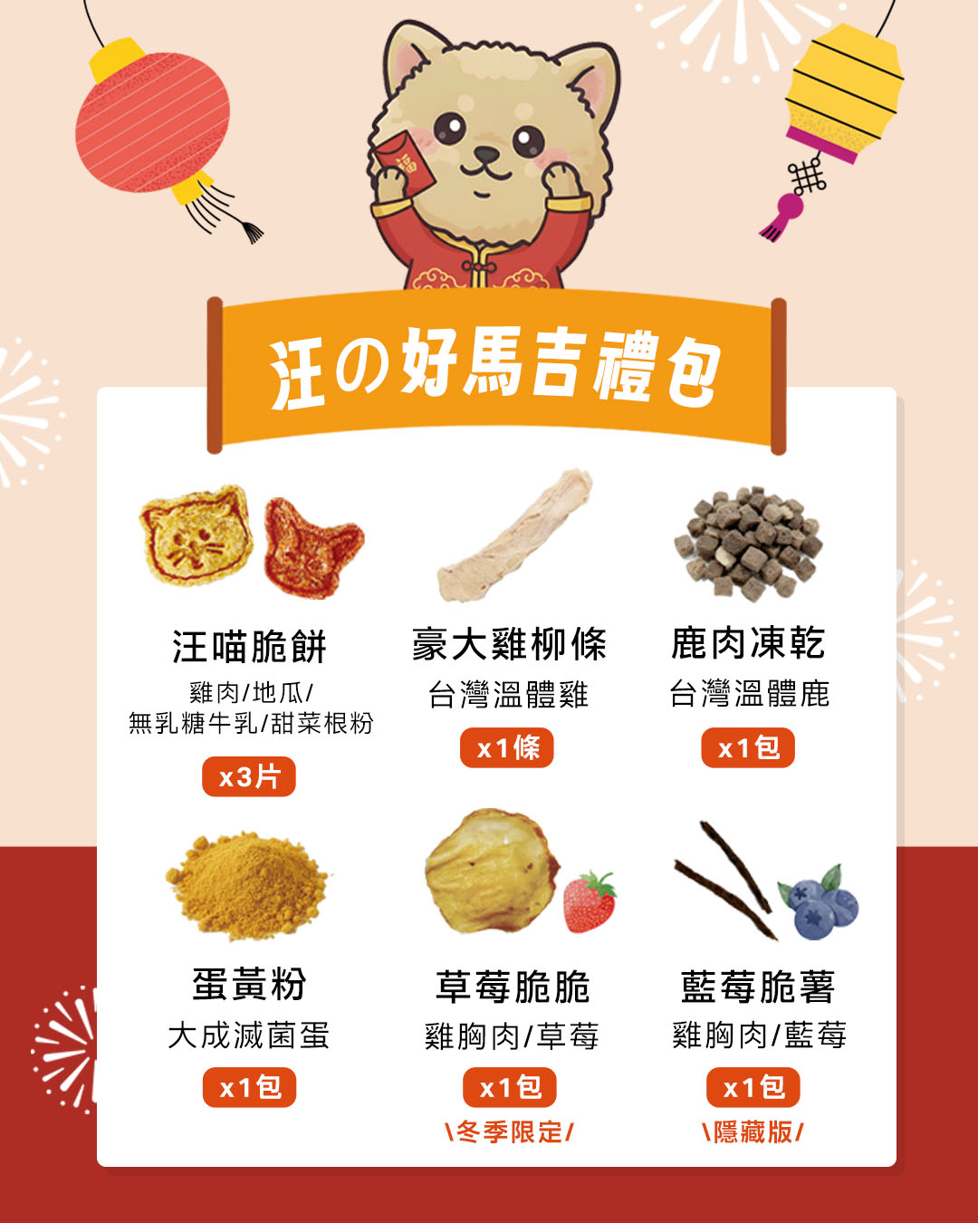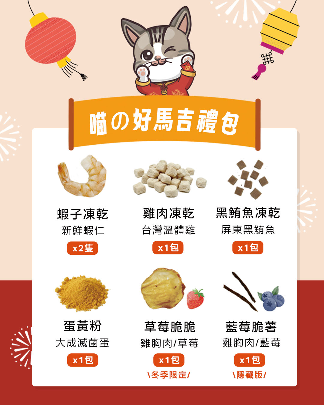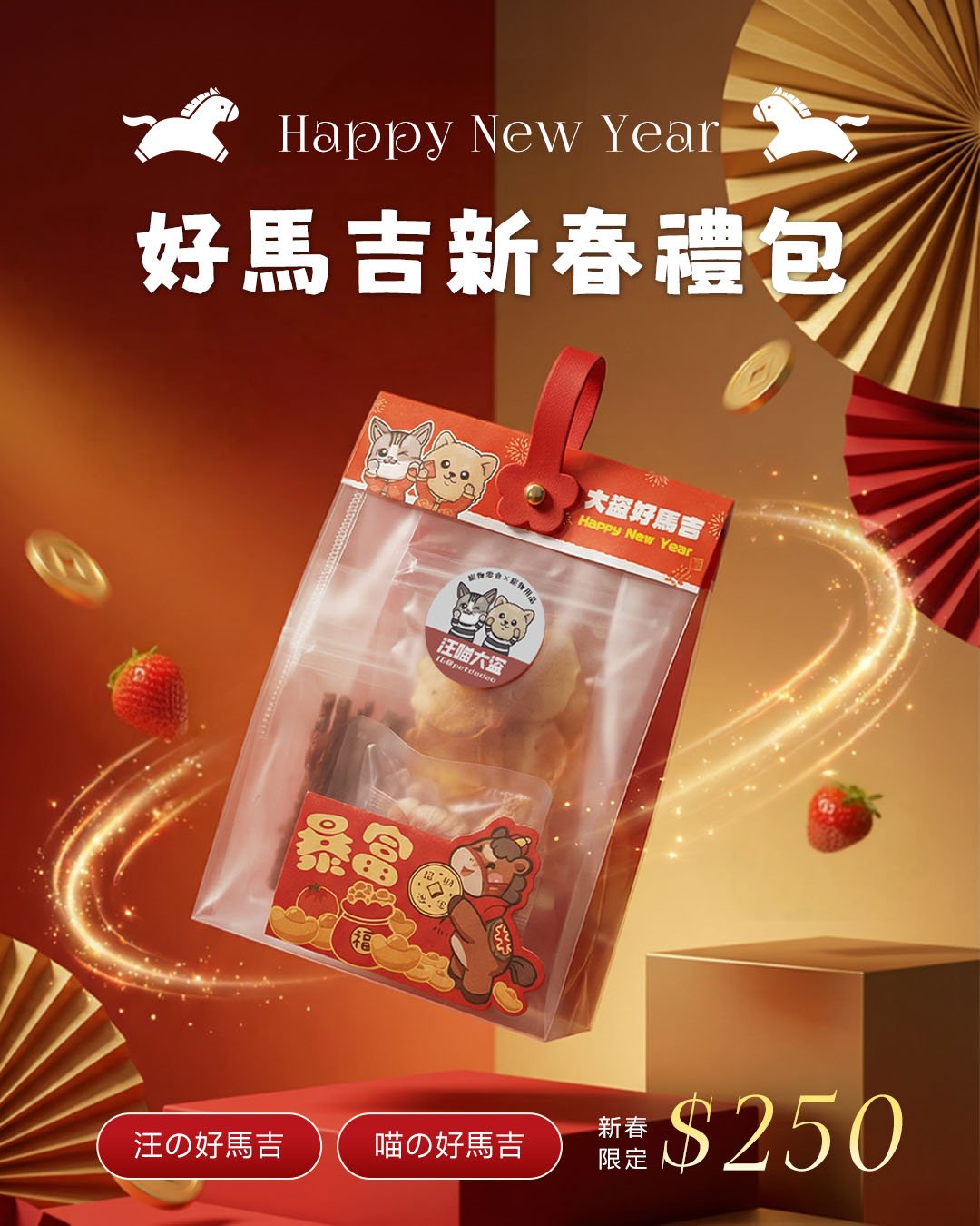 首頁 商店 所有商品 好馬吉新春禮包好馬吉新春禮包NT$250這是汪喵大盜送給毛孩的新年祝福 我們只想在你們身邊 做那個不離開的好馬吉𛰧 汪の好馬吉 𛰨 口味: 汪喵脆餅、豪大雞柳條、鹿肉凍乾、蛋黃粉、草莓脆脆、藍莓脆薯𛰧 喵の好馬吉 𛰨 口味: 蝦子凍乾、雞肉凍乾、黑鮪魚凍乾、蛋黃粉、草莓脆脆、藍莓脆薯毛孩請選取一個選項汪の好馬吉喵の好馬吉汪の好馬吉喵の好馬吉清除 好馬吉新春禮包 數量 加入購物車 立即了解 ⊝ 出貨小提醒 ×⚠️出貨提醒 我們會備有少量現貨 零食若無現貨製作天數約 3~7 天 (不含配送天數) 如需確認製作進度歡迎加入官方 LINE 與我們聯繫 加入官方 LINE 詢問 運費常溫零食 $60冷凍鮮食 $150全館滿 NT$820 即可享有免運 描述 額外資訊 評價 (0) 毛孩汪の好馬吉, 喵の好馬吉 商品評價目前沒有評價。 搶先評價 “好馬吉新春禮包”取消回覆發佈留言必須填寫的電子郵件地址不會公開。 必填欄位標示為 *您的評分 *評分…完美很好一般不錯很差 名稱 *電子郵件 *您的評價 * 在瀏覽器中儲存顯示名稱、電子郵件地址及個人網站網址,以供下次發佈留言時使用。送出 相關商品雞肉棒棒糖 NT$35 – NT$250價格範圍:NT$35 到 NT$250選擇規格 此產品有多種款式。 可在產品頁面選擇選項 蘋果咬一口 NT$50 – NT$250價格範圍:NT$50 到 NT$250選擇規格 此產品有多種款式。 可在產品頁面選擇選項 咕咕雞柳條 NT$150 – NT$250價格範圍:NT$150 到 NT$250選擇規格 此產品有多種款式。 可在產品頁面選擇選項