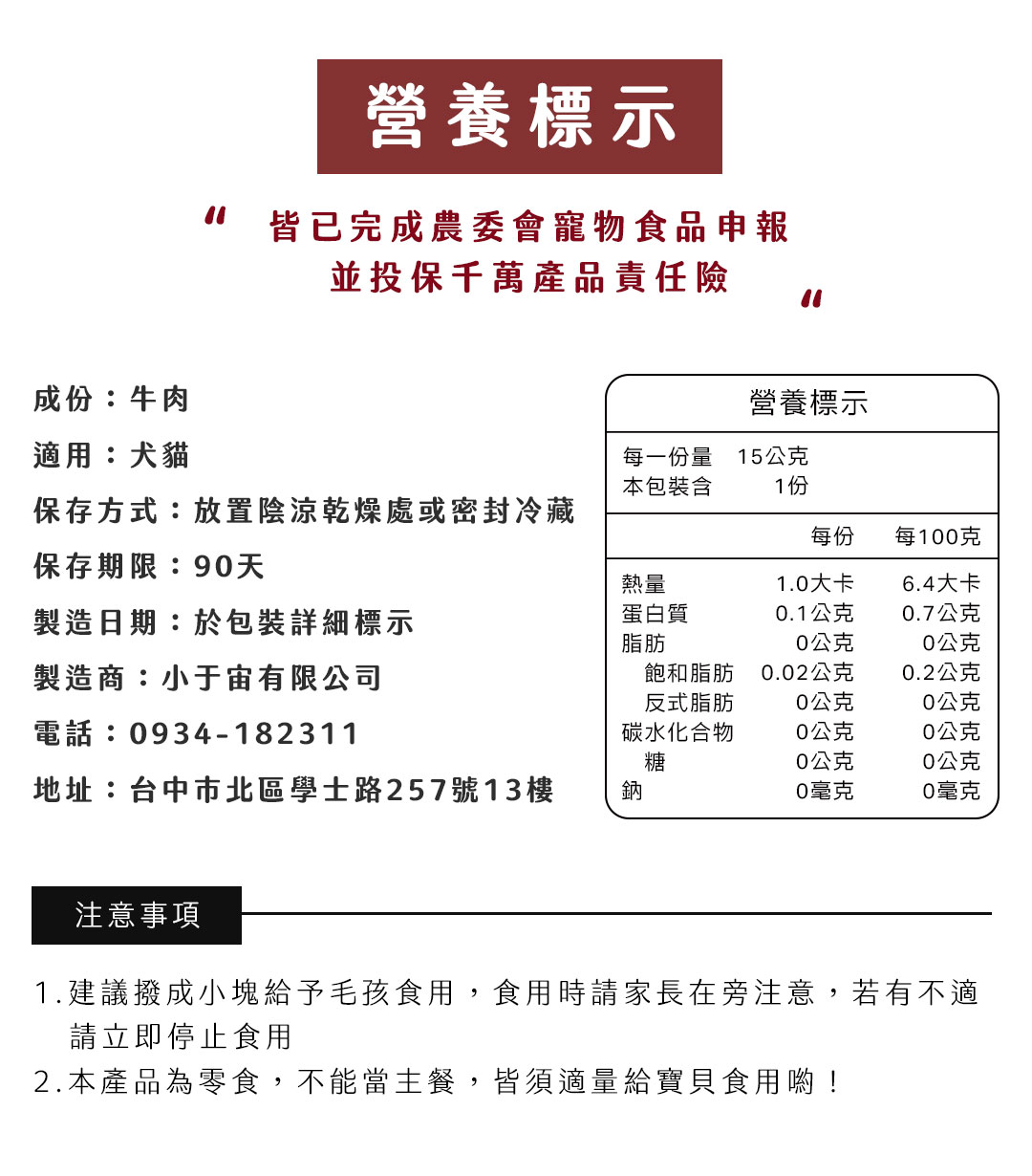 首頁 商店 小口咬の點心 牛肉片 牛肉片NT$80 – NT$150價格範圍:NT$80 到 NT$150嚴選香濃純牛肉硬度:★☆☆☆☆征服挑嘴貓首選小片狀更符合幼貓、老貓的適口性犬貓皆可食用手作寵物零食,堅持低溫慢烘12小時無添加、無防腐劑包裝請選取一個選項小包15g大包30g小包15g大包30g清除 牛肉片 數量 加入購物車 立即了解 ⊝ 出貨小提醒 ×⚠️出貨提醒 我們會備有少量現貨 零食若無現貨製作天數約 3~7 天 (不含配送天數) 如需確認製作進度歡迎加入官方 LINE 與我們聯繫 加入官方 LINE 詢問 運費常溫零食 $60冷凍鮮食 $150全館滿 NT$1,000 即可享有免運 描述 額外資訊 評價 (0) 包裝小包15g, 大包30g 商品評價目前沒有評價。 搶先評價 “牛肉片”取消回覆發佈留言必須填寫的電子郵件地址不會公開。 必填欄位標示為 *您的評分 *評分…完美很好一般不錯很差 名稱 *電子郵件 *您的評價 * 在瀏覽器中儲存顯示名稱、電子郵件地址及個人網站網址,以供下次發佈留言時使用。送出 相關商品咕咕雞柳條 NT$150 – NT$250價格範圍:NT$150 到 NT$250選擇規格 此產品有多種款式。 可在產品頁面選擇選項 蛋黃玫瑰塔 NT$50 – NT$150價格範圍:NT$50 到 NT$150選擇規格 此產品有多種款式。 可在產品頁面選擇選項 好馬吉新春禮包 NT$250選擇規格 此產品有多種款式。 可在產品頁面選擇選項